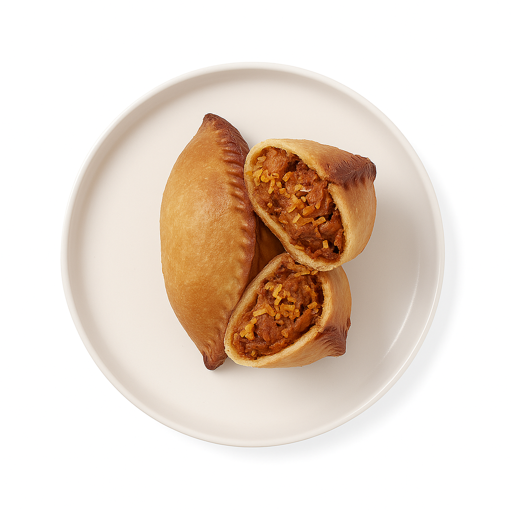 A slow‑cooked celebration folded into flaky pastry. Tender beef chuck simmers with coconut milk, galangal, lemongrass, and toasted spices until the flavor turns deep, caramelized, and richly aromatic. Bright citrusy notes and warm turmeric lift the savory coconut base, while shredded coconut adds a toasty finish — everything you love about rendang, made handheld and ready in minutes.